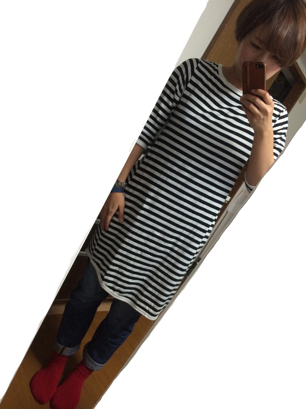 mirikoのワンピース「BEAMS BOY / 1cmボーダー 7分袖ワンピース」を使ったコーディネート