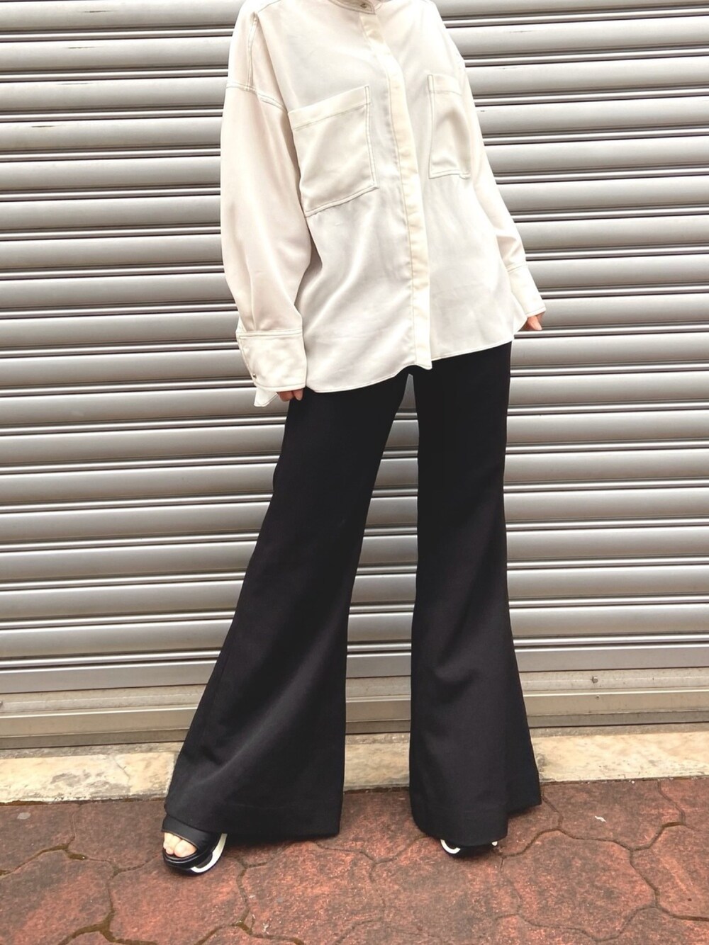 シアーシャツ。 白のブラウスに裾にかけて広がりのある黒のパンツを合わせてみました。いつもは色が入ったコーデをしがちですが、今日は大人っぽくモード系です。 黒のステッチと両外ポケットが大きめなのと、ラグランなデザインがモードなファッションをより引き立ててくれます。 パンツはSYLので、ウエスト部分がファスナーであまりストレス感じず着れると思います。私は162センチなのですが、裾も少し長めで、厚底や、ヒールのあるものと合わせるとより脚を長く魅せてくれます!ヒールなしだと、ちょうど地面に裾がつくくらいの丈感です。