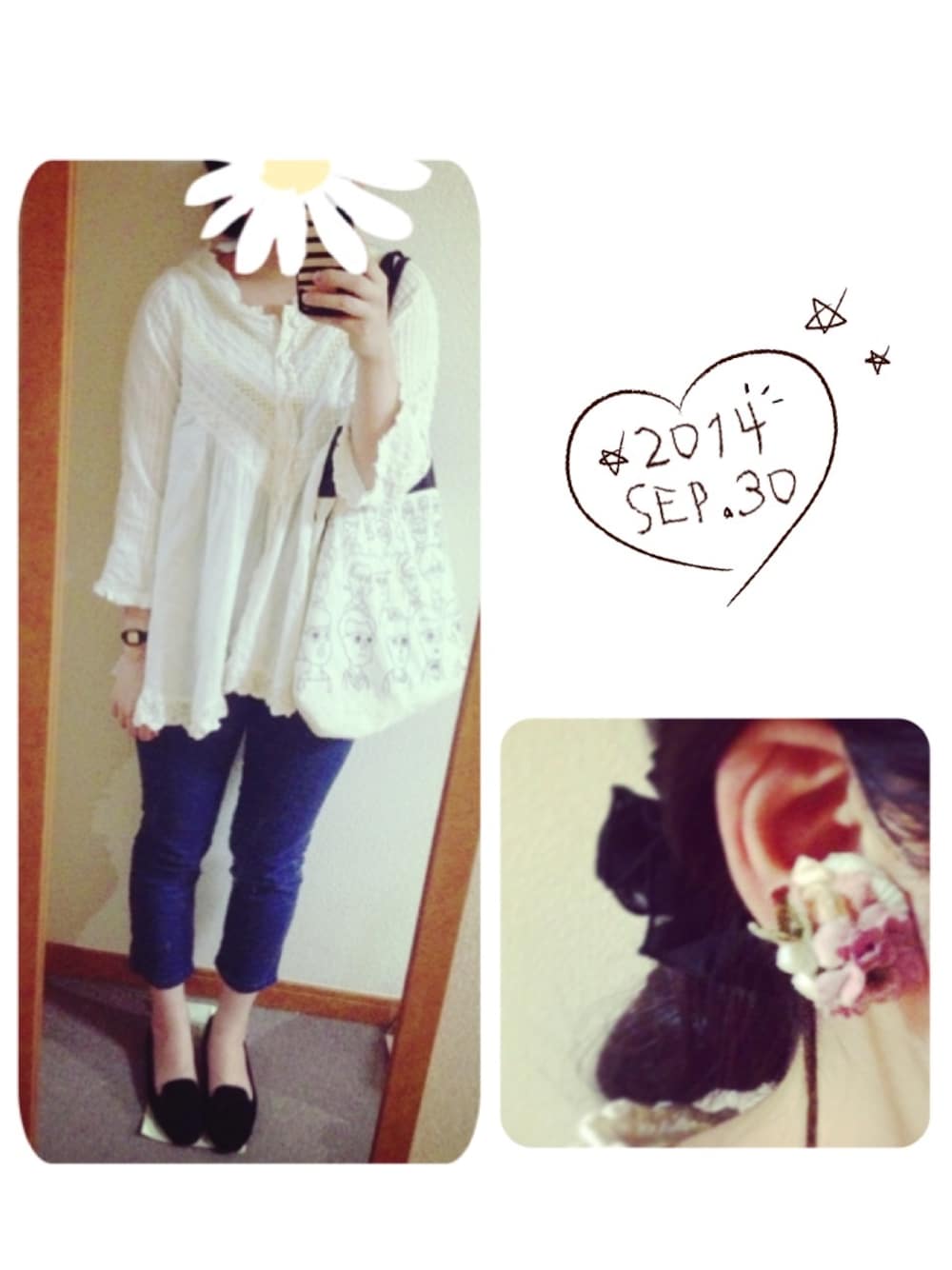最近シンプルな服装が好きかなー flowerのデニムパンツ買ったのはいいけど少しきついからダイエットしなきゃ笑 ブラウス/mystic ウエストリボンデニムパンツ/flower
