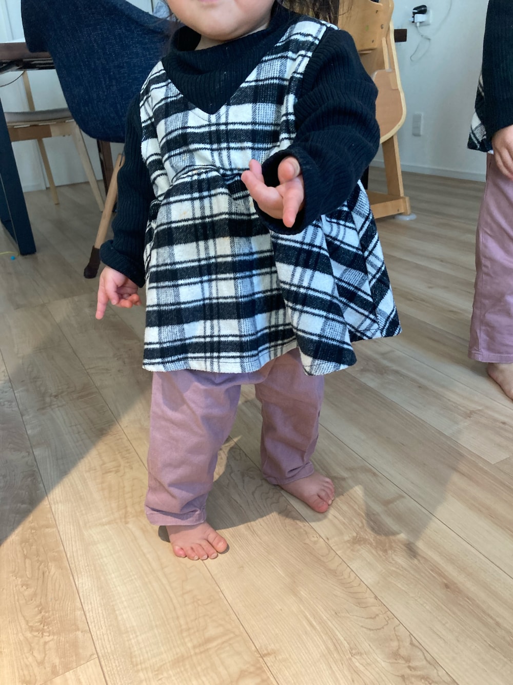 毎回セットアップのタグが不明です😂 黒を上に着せたら下ピンク履かせたくなる 癖がある😁 セトアなので下短パンでタイツもいいんだけど、、 タイツだと家の中、転ける率高いので ズボンにしました﹗﹗ ちなみに姉も同じコーデでした♪