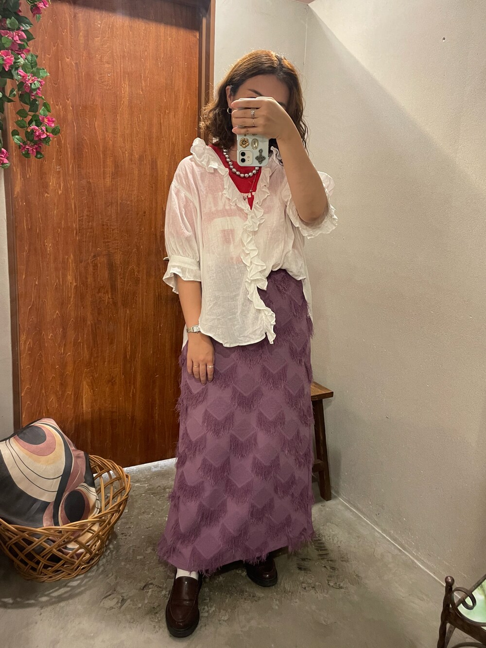 カラー合わせをする時はちらっと見せるくらいだと取り入れやすい。赤のナンバリングTをブラウスの中に潜めてカジュアルに崩しました。