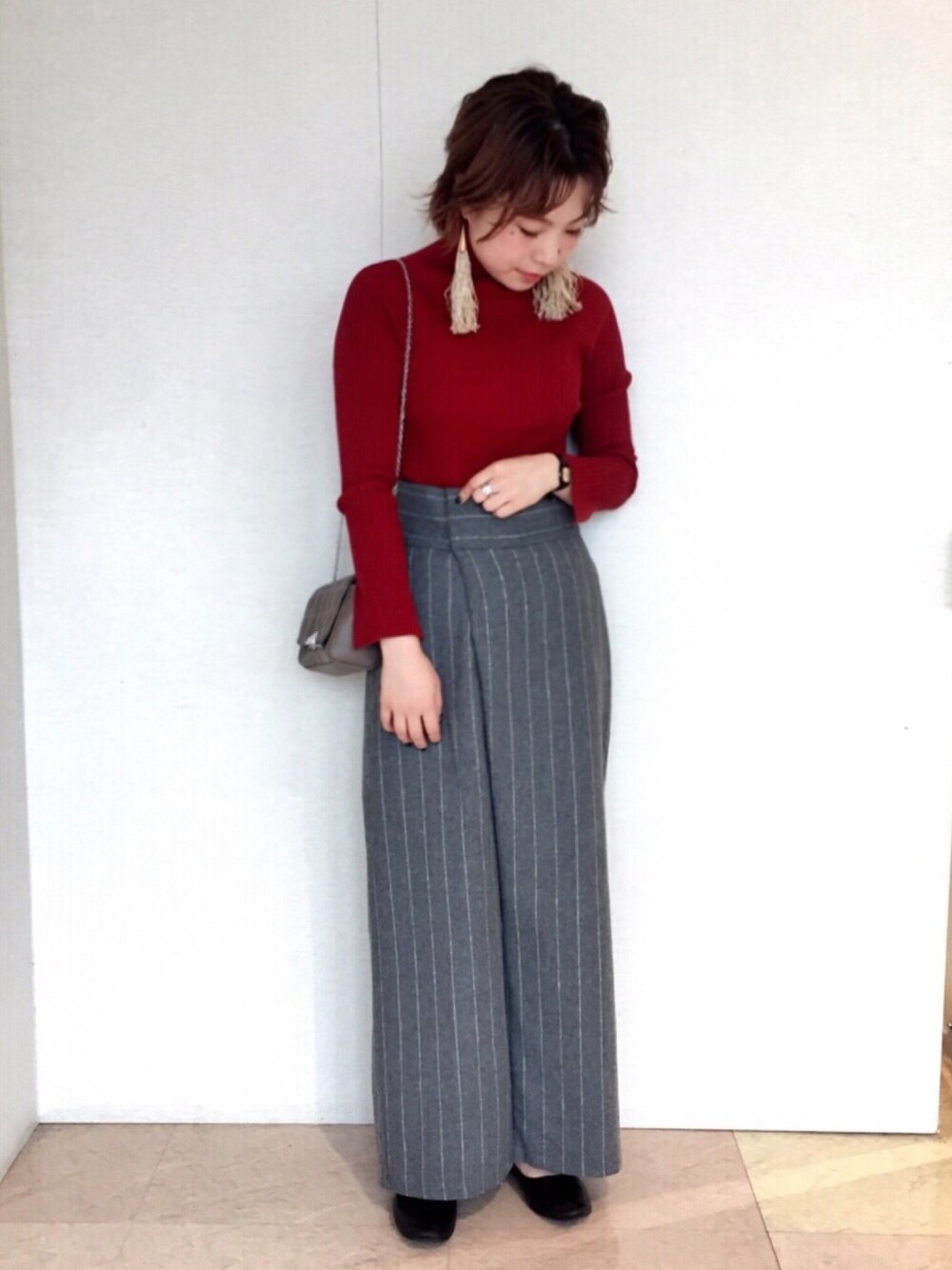 赤ってなかなか 着こなしずらいイメージ だったんですけど グレーと合わせると強すぎず 着られました😊