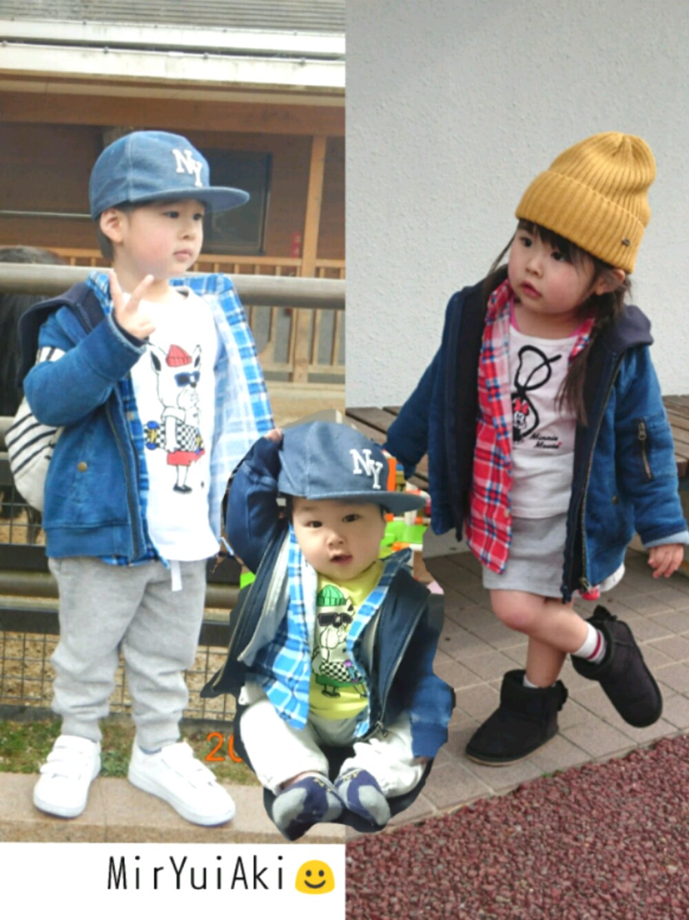 前回と同じようなコーデ😂 娘はムートンブーツがお気に入りでスニーカーはかそうとしたけど履いてくれなかった😑 女の子のほうが我が強いうえになかなかまげません😂😂