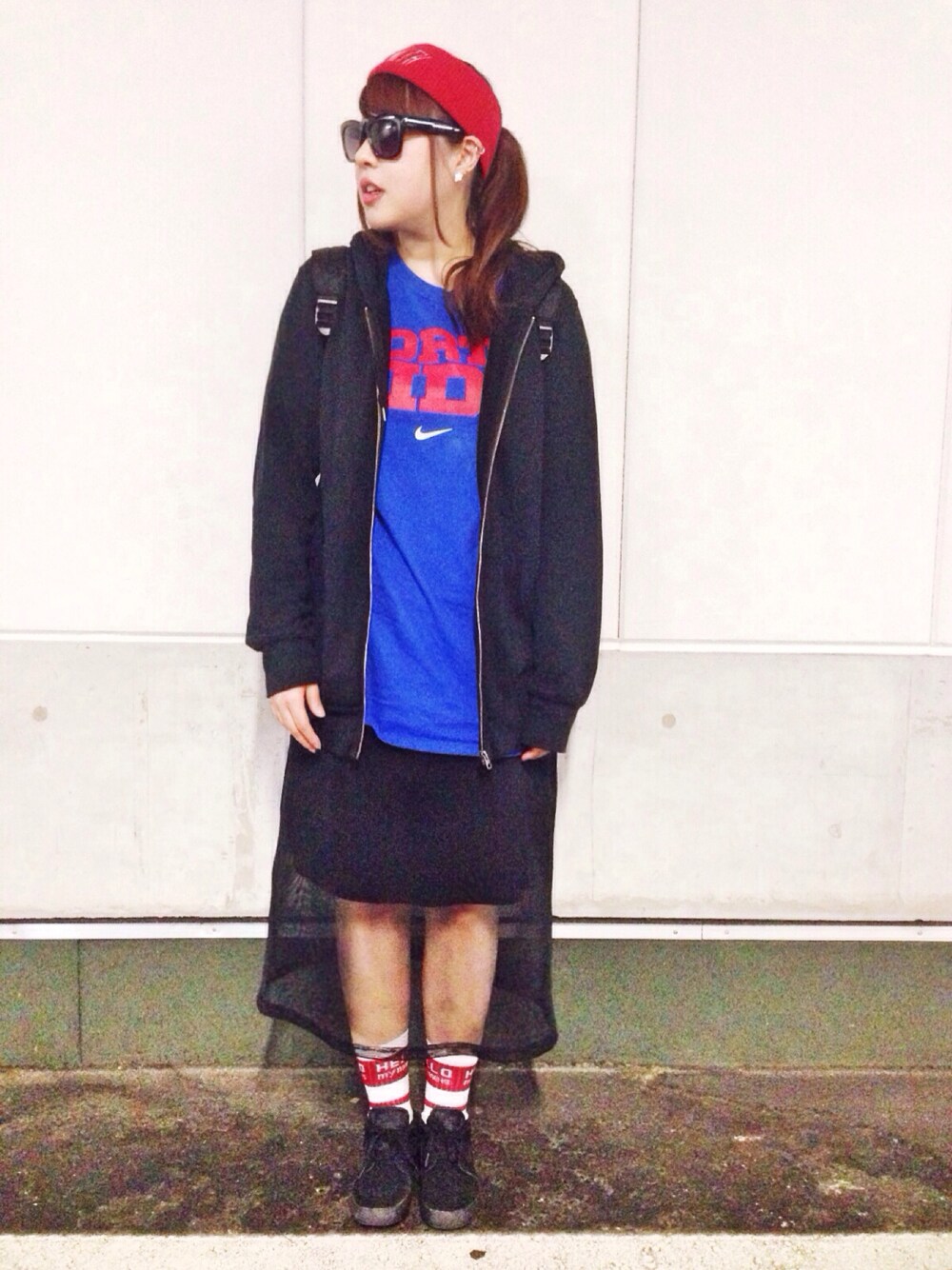 こないだ古着屋さんで買った NIKEのTシャツ着たくて 青×赤コーデ\(^o^)/❤️ アメリカ〜ン🇺🇸🇺🇸🇺🇸w ヘアバンにポニーテールです! そしてバックプリントかわいいので 小窓に載せておきます👕 クマさん🐻🐻🐻