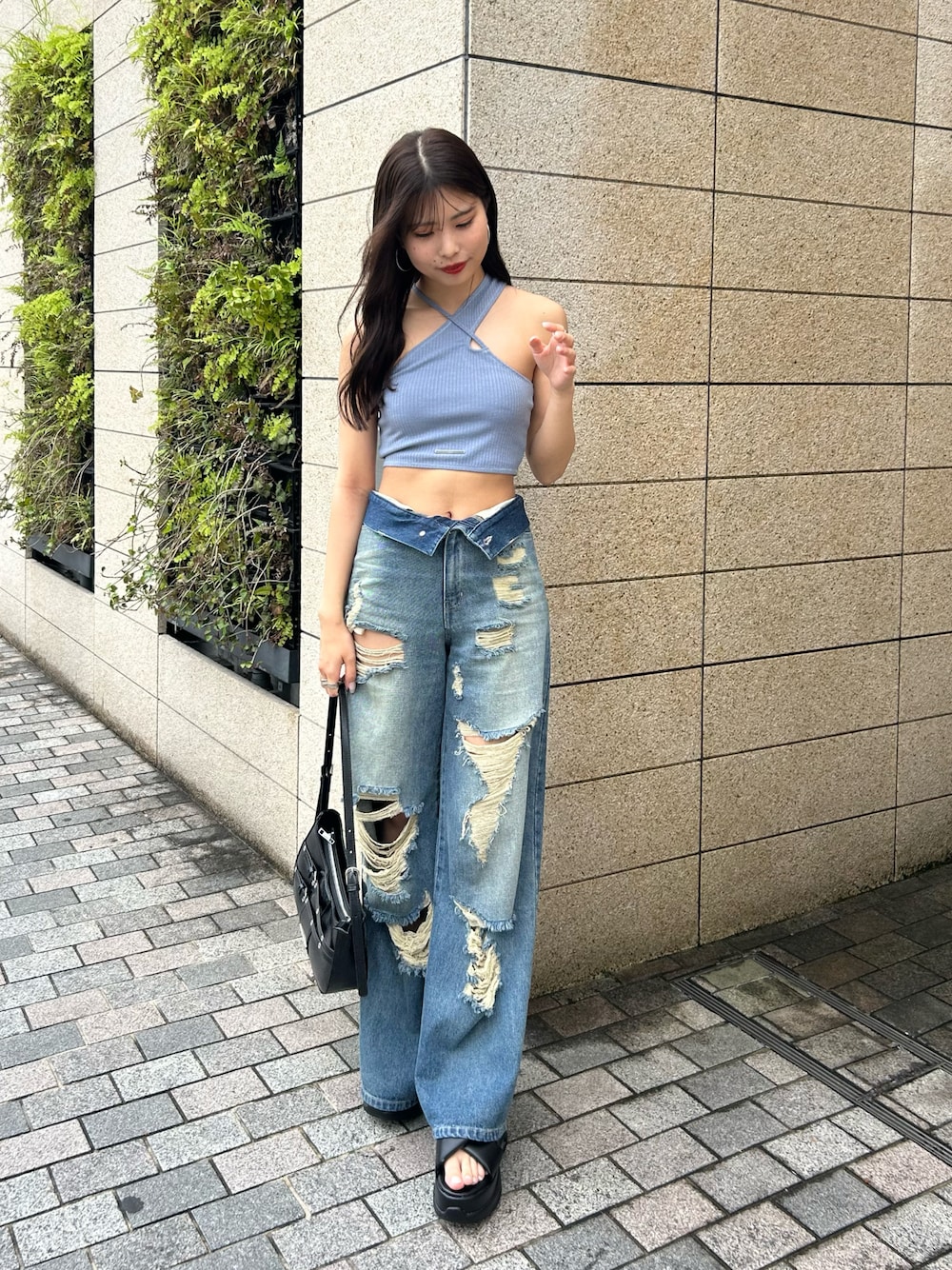 Misato(Chico 名古屋PARCO店)のデニムパンツ「【2サイズ/6色展開】ダメージワイドデニムパンツ」を使ったコーディネート