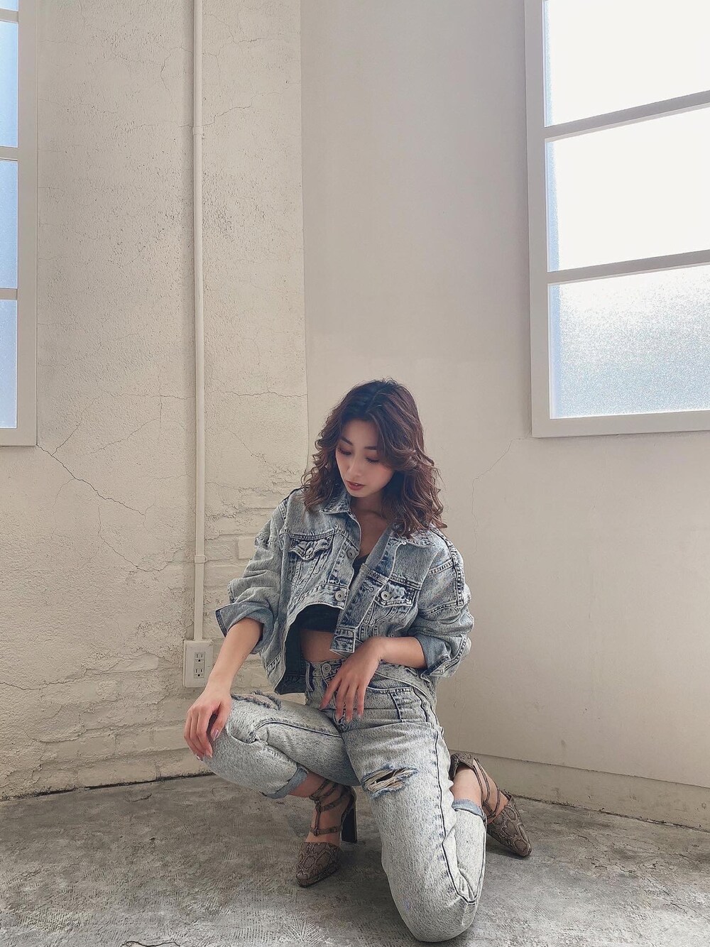 Misa(GYDA)のデニムジャケット「【セットアップ着用可】BACKロングショート ケミカルデニムGジャン」を使ったコーディネート