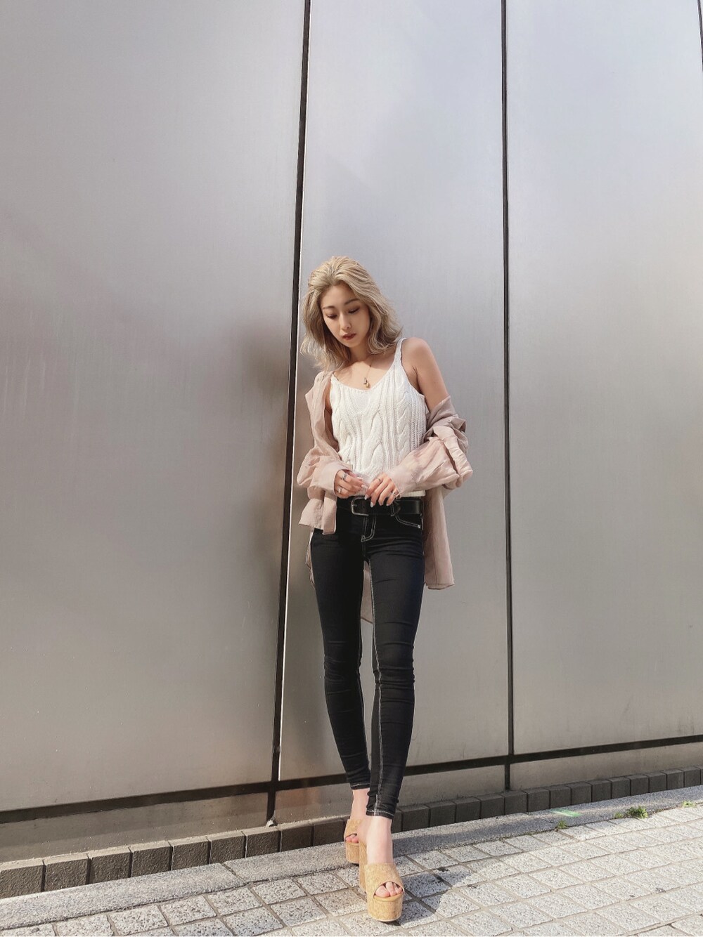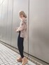 淡いカラーの合わせにはブラックのスキニーでしっかり締めるのがポイントです