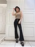 ボタンがアクセントのハイウエストのフレアパンツはなんといっても美脚効果抜群です!! 着用のブラックはとても伸縮性が高くウエスト部分も滑らかに包み込んでくれます♡ ショート丈のトップスと合わせるとスタイルアップできますし、ウエストの露出がヘルシーにまとまりますので、おすすめです♡