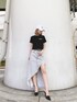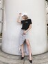インパクトのあるバックロゴがポイントのショートTシャツはブラックを選び、よりクールなデザインなのでグレーのケミカルデニムでカジュアルコーディネートです♡ キャップを合わせてボーイッシュな印象なので足元はミュールで女性らしさも忘れずに! ショート丈のtopsにハイウエストのロングスカートはスタイルアップも抜群のスタイリングです♡
