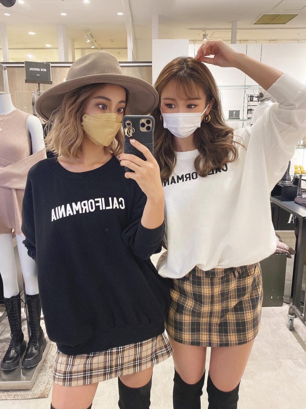仲良しのみくとお揃いコーデ♡ ロゴ付きスウェットはカジュアルな印象なのでチェックのミニスカ×ロングブーツで合わせると女性らしさもアップ♡海外風ファッションでトレンド感もしっかり取り入れられます。 スウェットは両サイドにポケットも付いていて一枚で着る季節でも実用性があり、とっても使いやすいです! スカートはGYDAお馴染みのスカートライクショートパンツなので中にサテンのインナーパンツがついています!短くても安心して履いていただけます😌