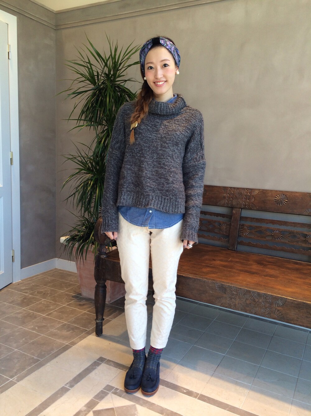 ざっくりニットとパンツで爽やかほっこりスタイル。