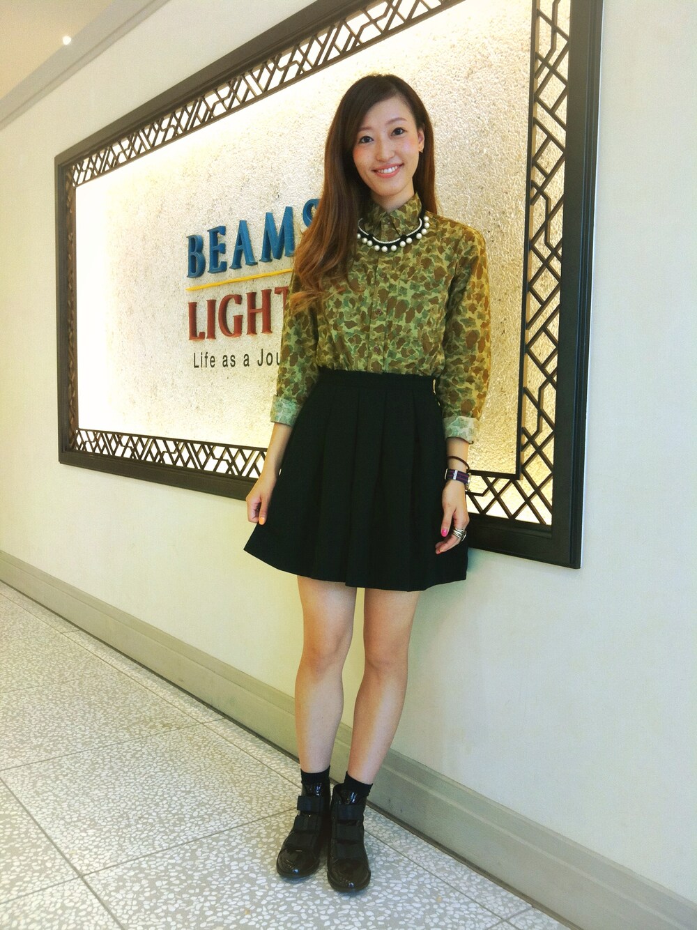 トレンドのカモフラ柄は、 フレアスカートと合わせてガーリーに。