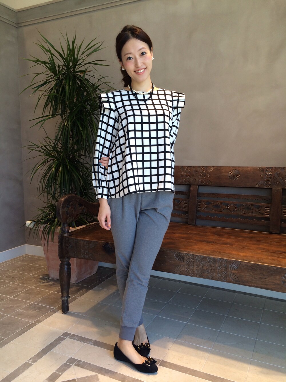 ボリュームのあるトップスはスウェットでスッキリとまとめて。