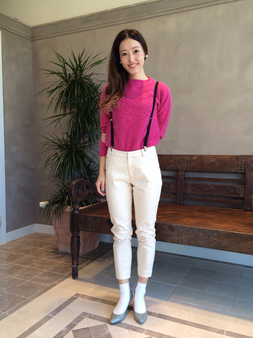 普通になりがちなコーディネートもショッキングピンクとサスペンダーでアクセントに☻