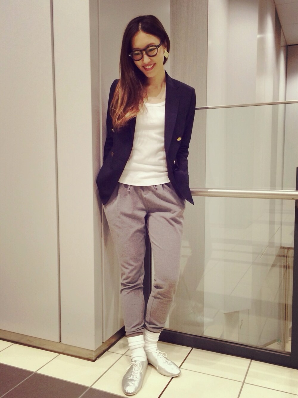 スウェットパンツを紺ブレで引き締めて。 ホワイトソックスで、スクール感も出しつつ..☆