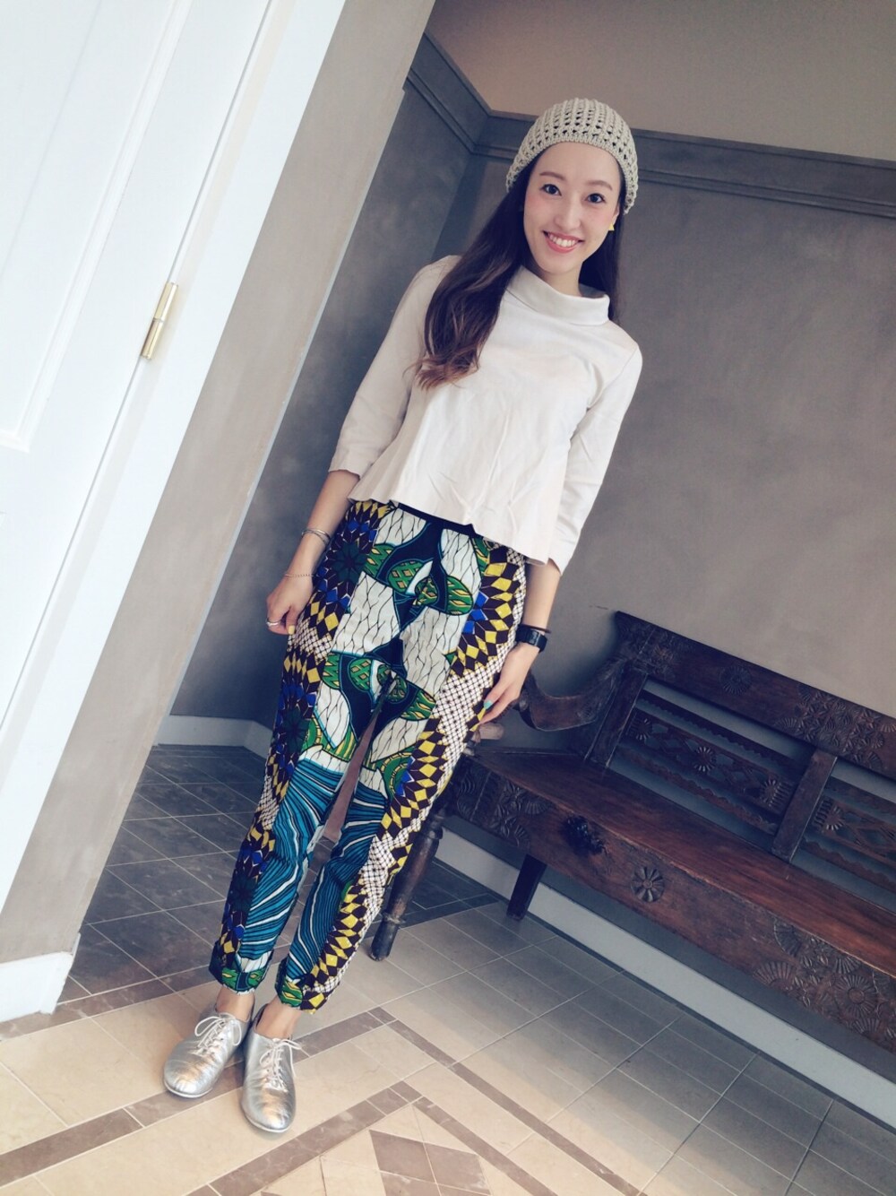 エスニック調のボトムは主張するので、トップスは大人しめに。 今日も元気にがんばります!
