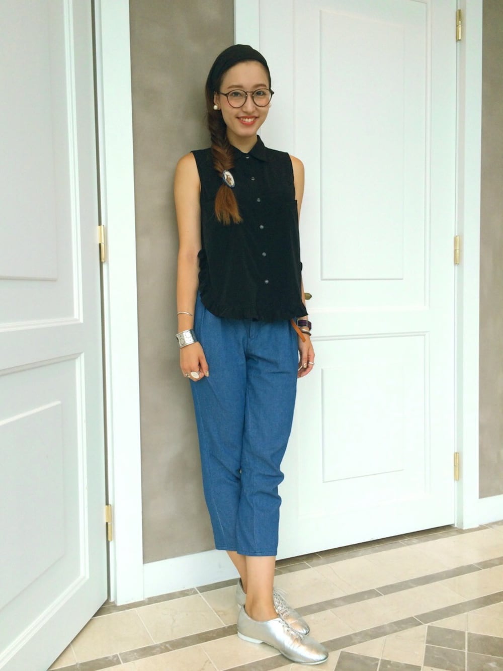 黒のノースリーブシャツはガラッと大人っぽくなる一枚。ダンスシューズとフィッシュボーンでくずした着こなしに。