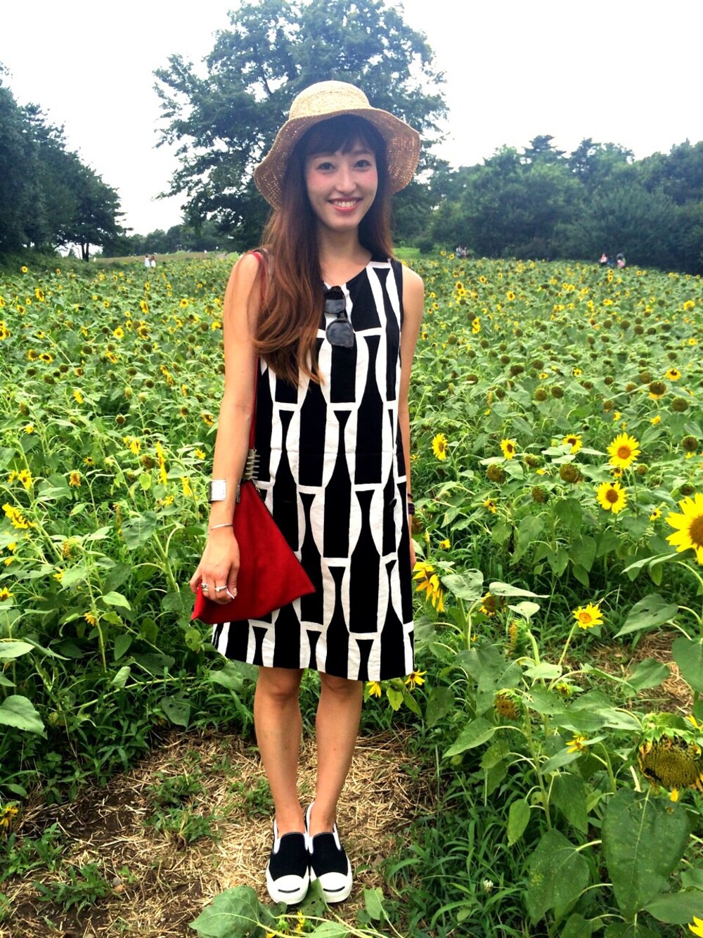 向日葵畑にきました。 大好きな向日葵に囲まれて幸せきぶん。 こういう特別な日はワンピース。 向日葵といったらストローハット。 onepiece,,,marimekko bag,,,B印YOSHIDA