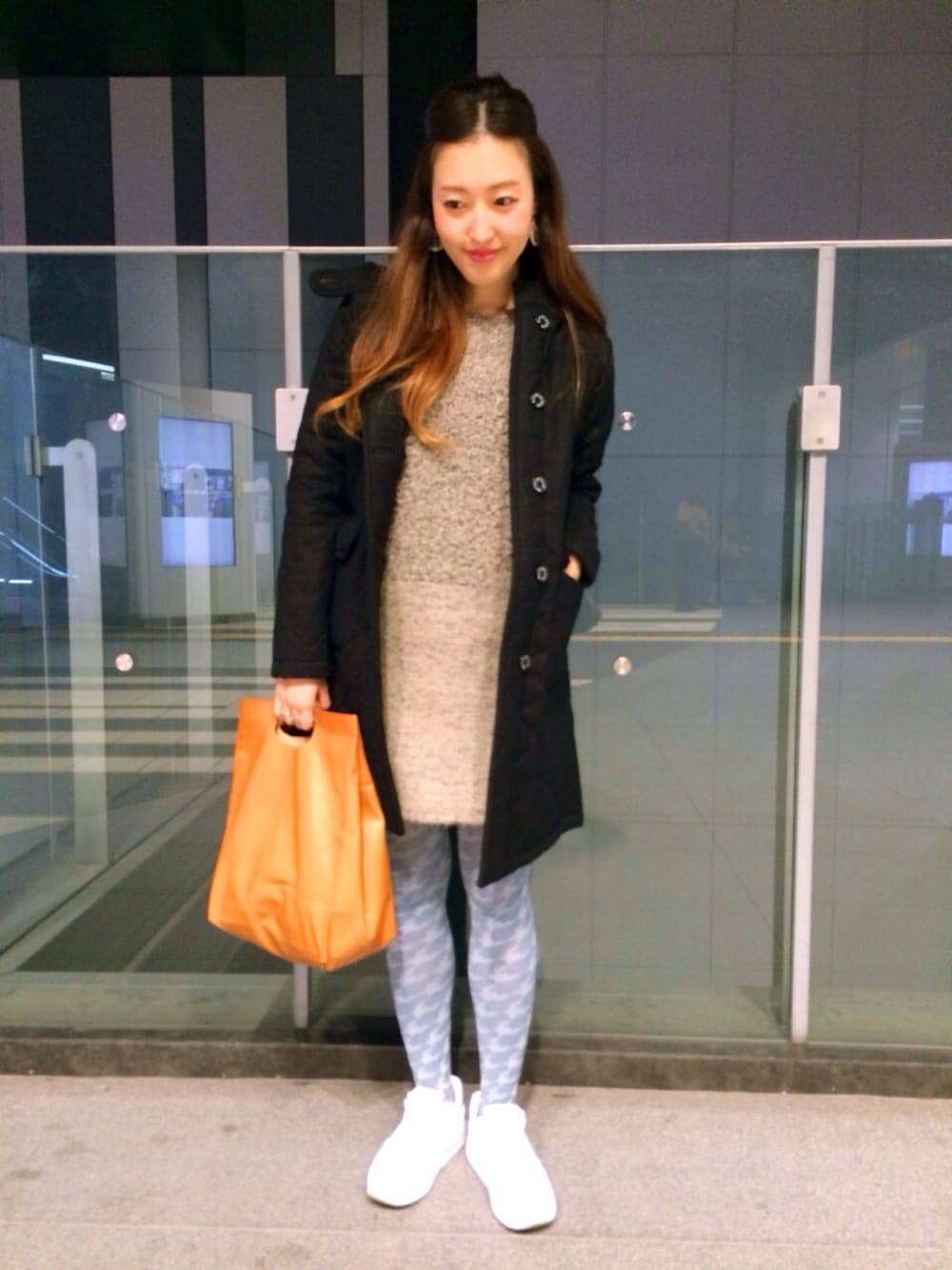 いつもの大好きなスタイル。ワンピース+タイツ+スニーカーの私の鉄板スタイルです。ビームスプラスの変わり種レザーBAGは雰囲気出ます!