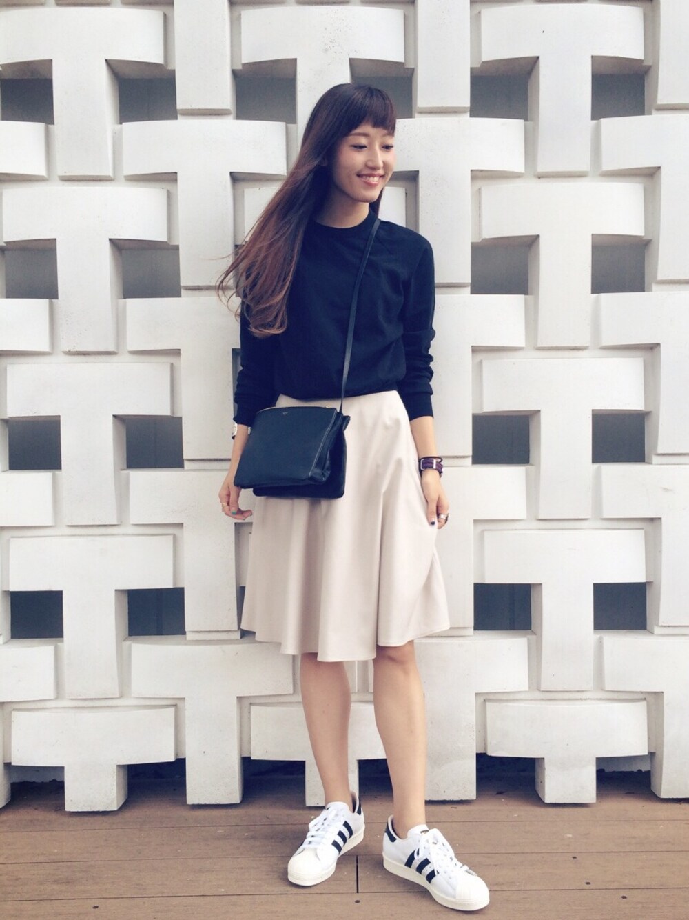 フレアなミドルレングススカートは トップスをタイトめにしてバランスをとりました。 足元はやっぱりスニーカー。adidas SS