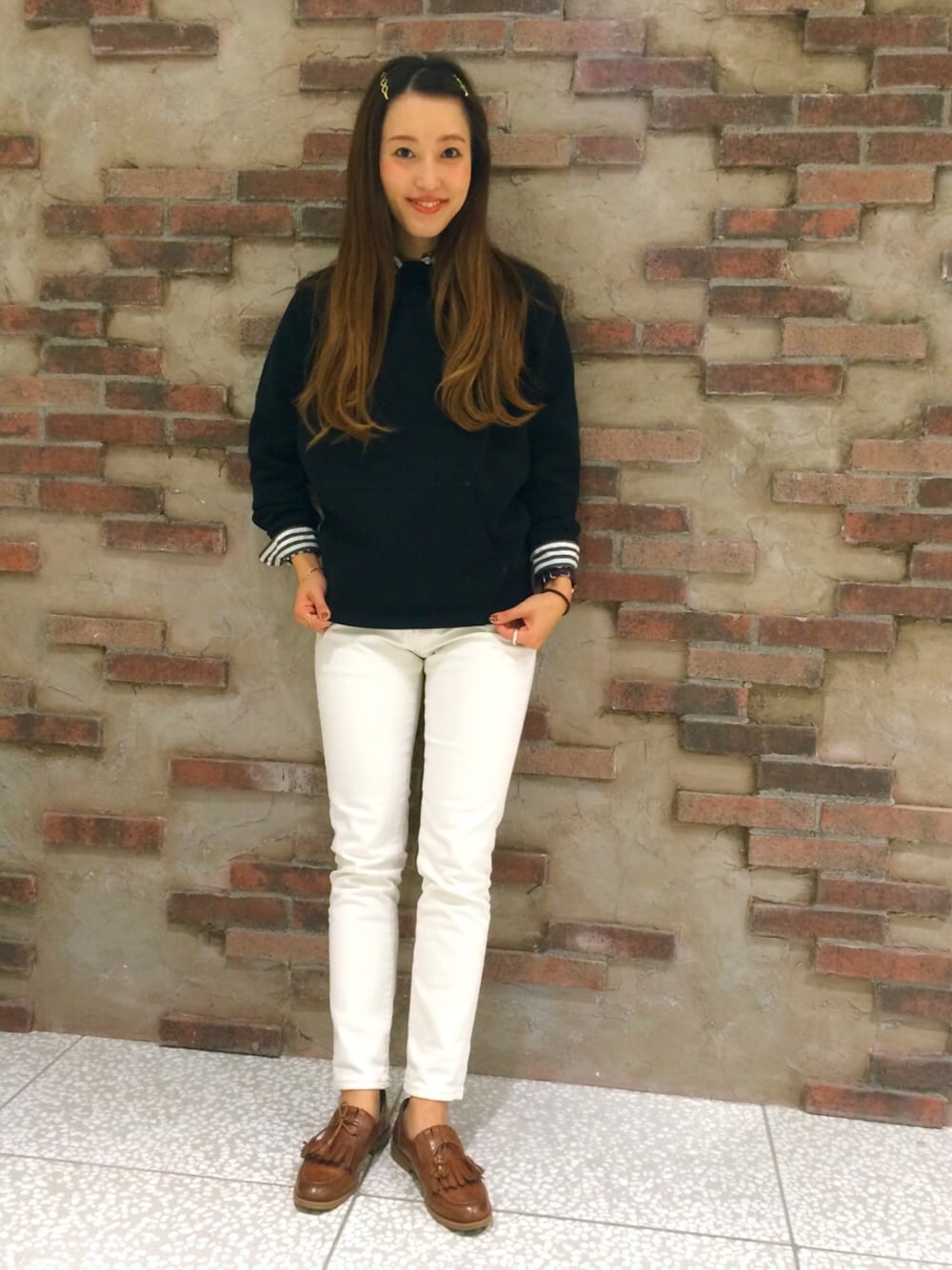 黒のスウェットにストライプのシャツをレイヤード。カジュアルになり過ぎないように足下もタッセルローファーで。