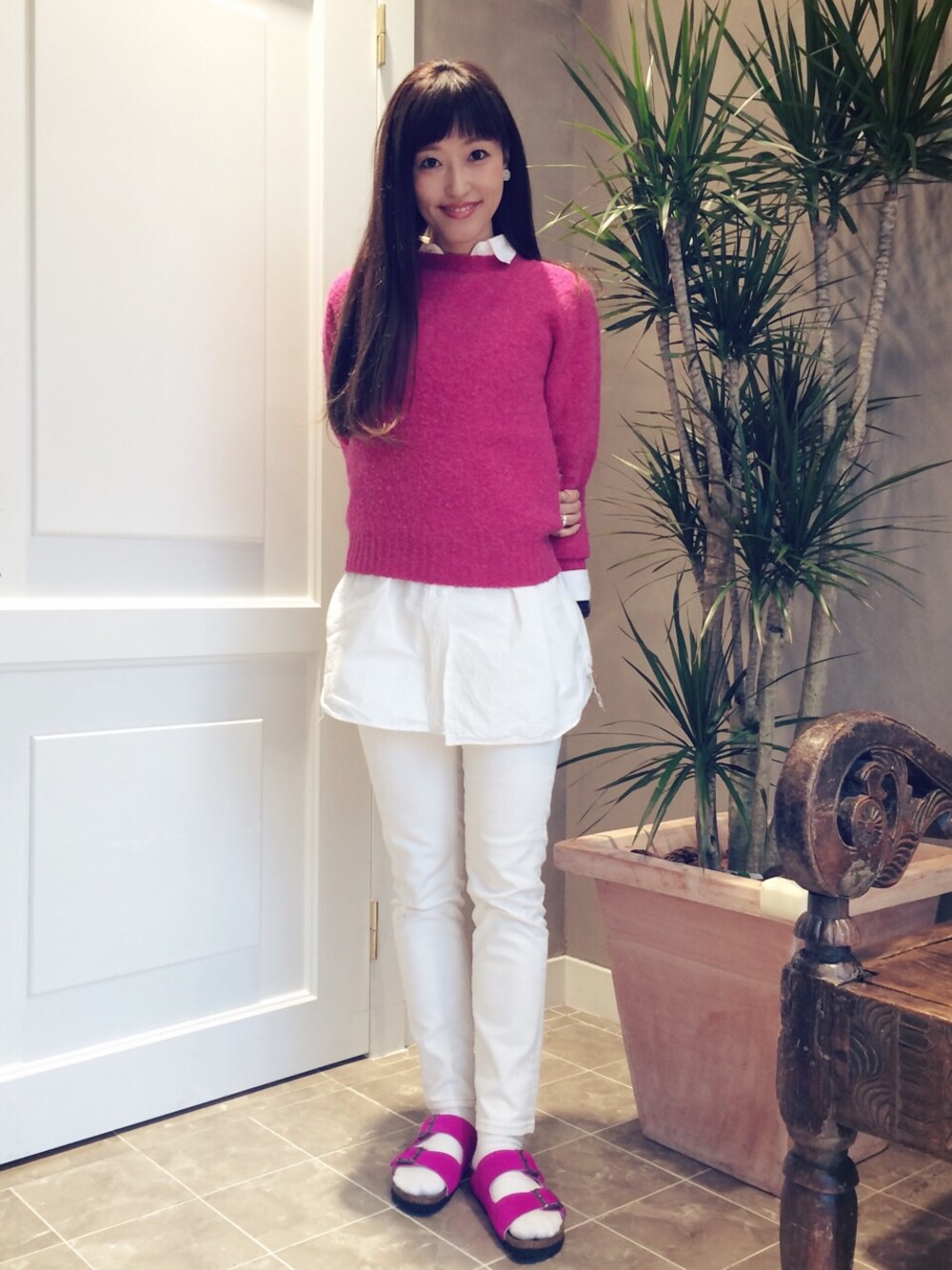 ピンクのパンチを効かせたコーディネート。 シルエットがとっても綺麗な着用のパンツは BEAMS LIGHTSでお取り扱いしております。