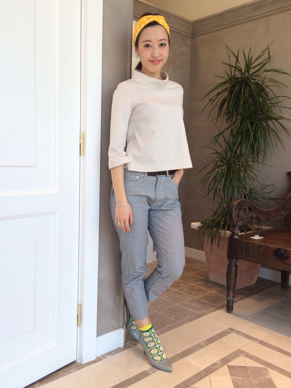 黄色を差し色にベージュが地味にぬらないようにクロップドパンツで。