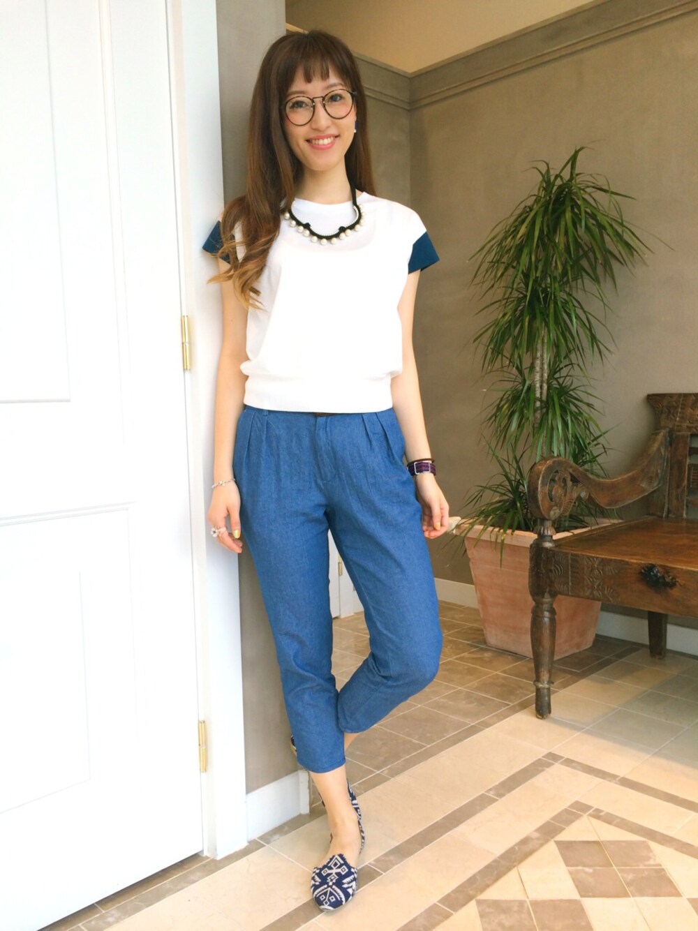 着用のデニムパンツは股上が深めでショート丈トップスにも合わせやすい! ウエストがゴムなので楽ちんです (^ω^)