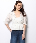 女性らしいシルエットのトップスは甘くなりすぎないようにベージュの七部丈パンツできれいにまとめました。