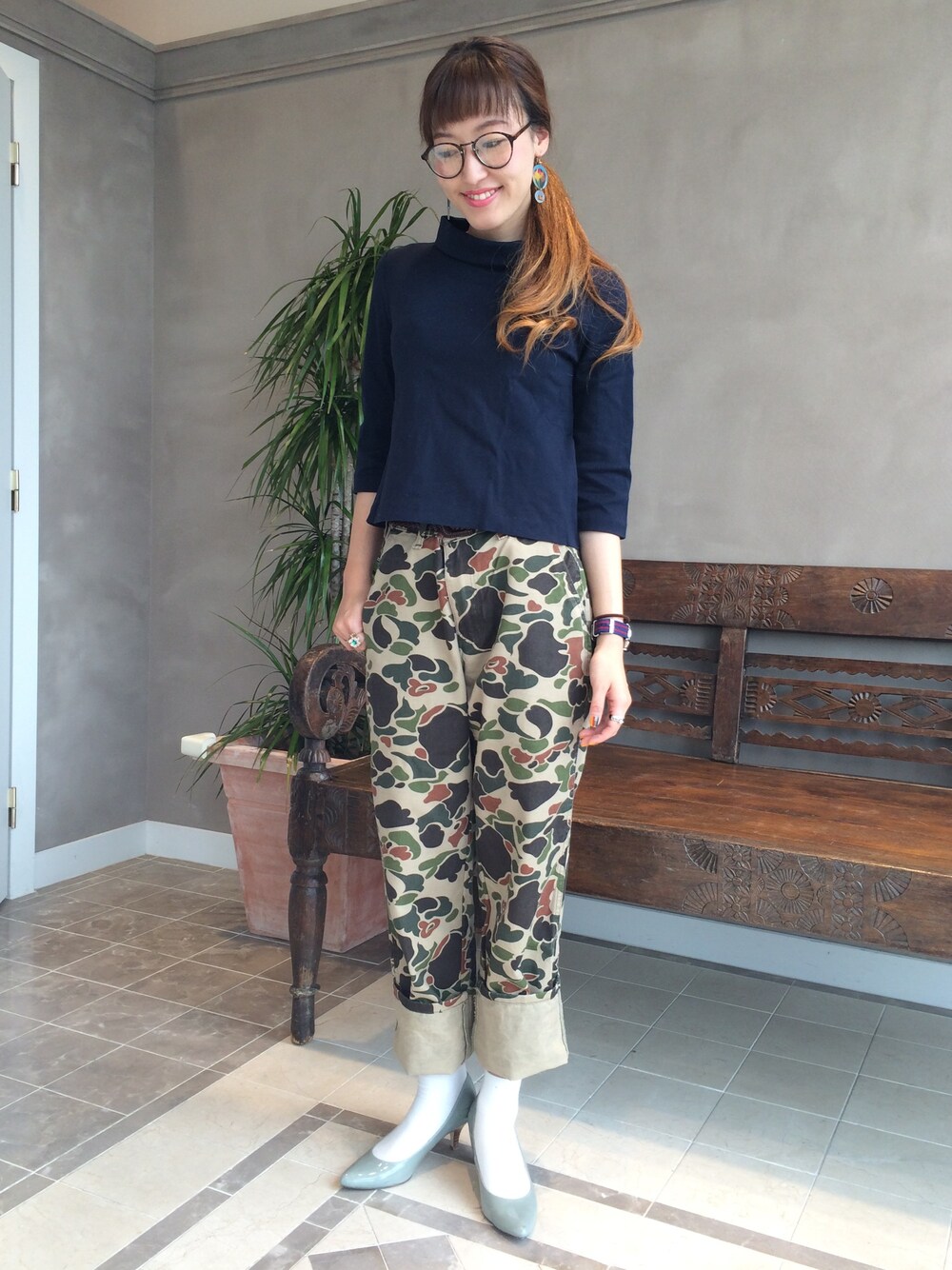 カモフラパンツでボーイッシュ感が出るときはヒールを合わせて女性らしさも忘れずに♡