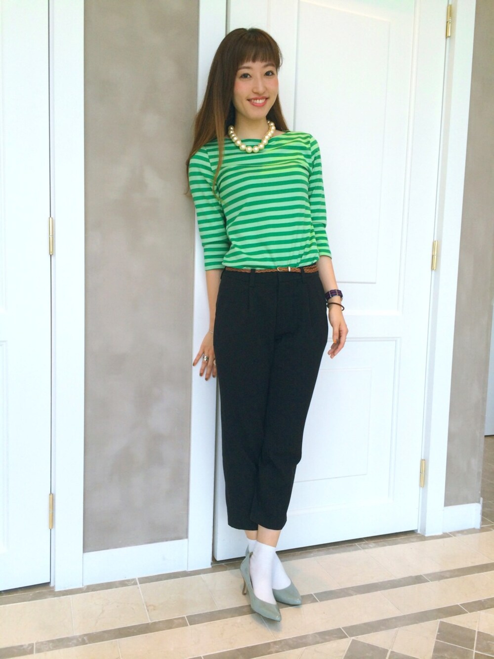 グリーンのボーダーは初挑戦アイテム! 黒と合わせて、スマートに! Tops..marimekko