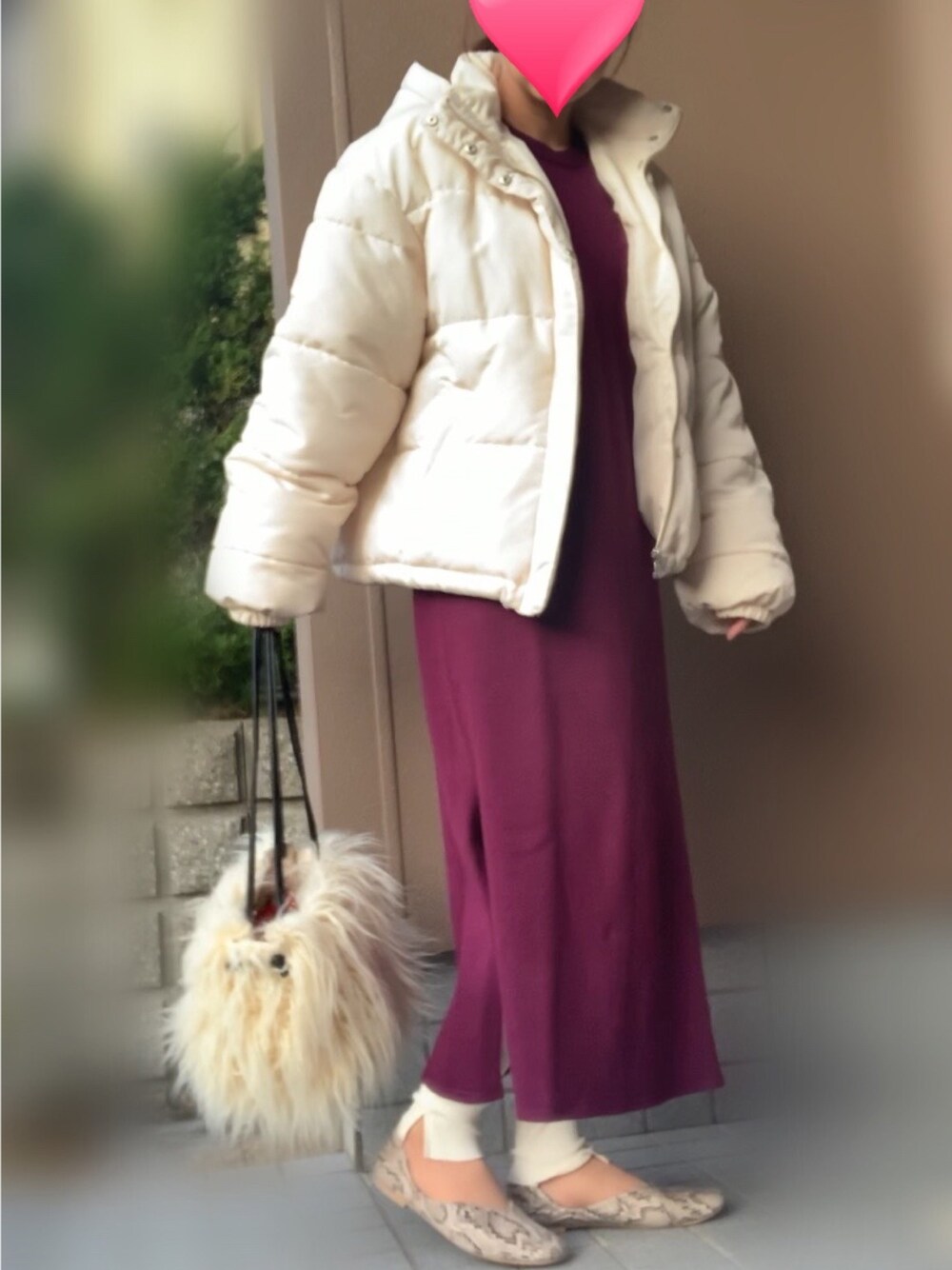 私にしては珍しいお色、ボルドーのニットワンピ👗サイドスリットが深めに入ってるから足さばきも楽チン🙆♀️ ボルドーとホワイトのコーディネートに足元スネーク柄を入れてみた😊