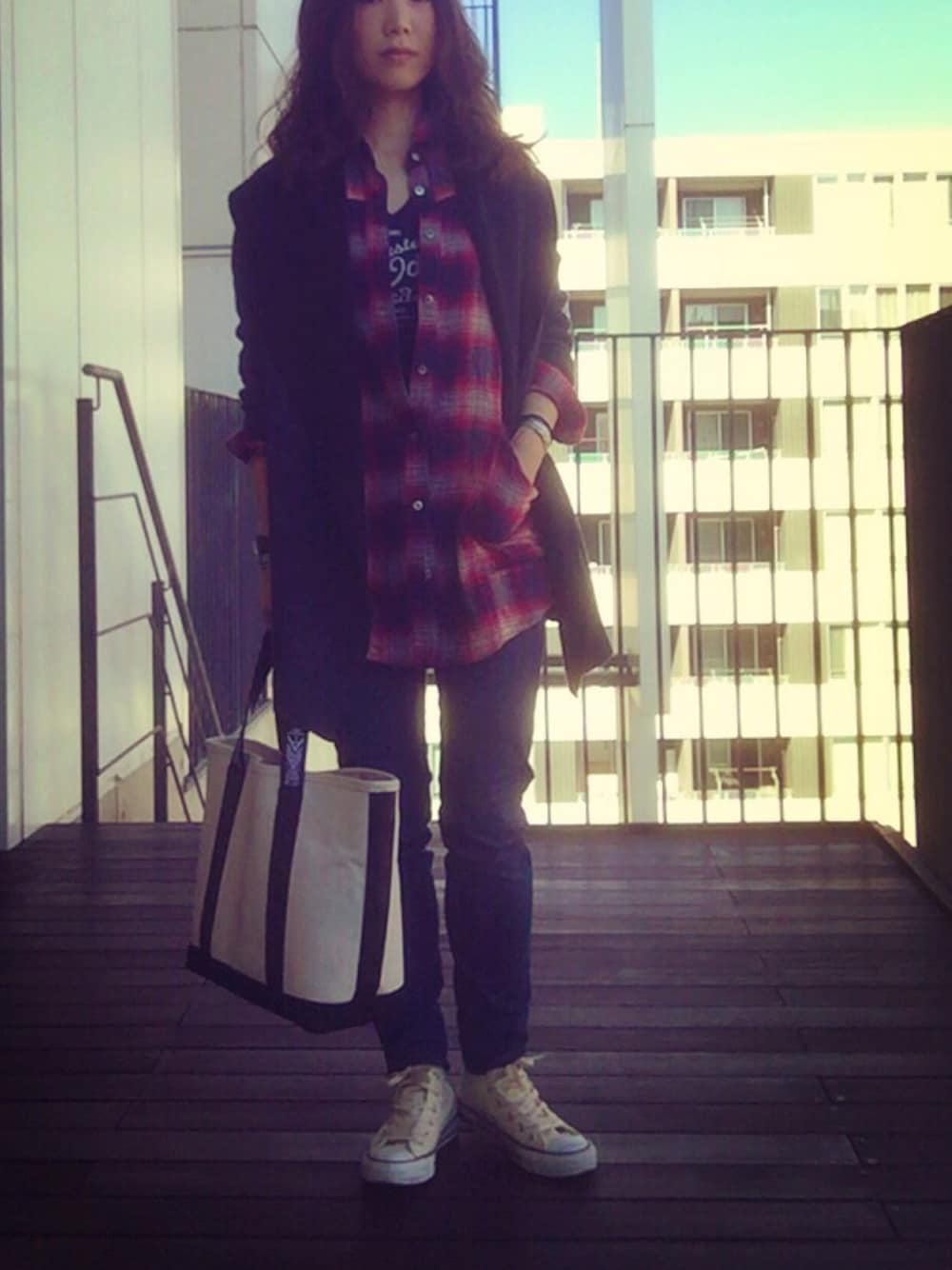 ☆ RED × Gray × denim ☆ 今日はだいぶカジュアルに ネルシャツで☺︎ チュニック丈なので お尻が隠れて安心(笑) ニットカーデもオーバーサイズなのが 気に入ってて だいぶ着倒してるから毛玉とらねば💦