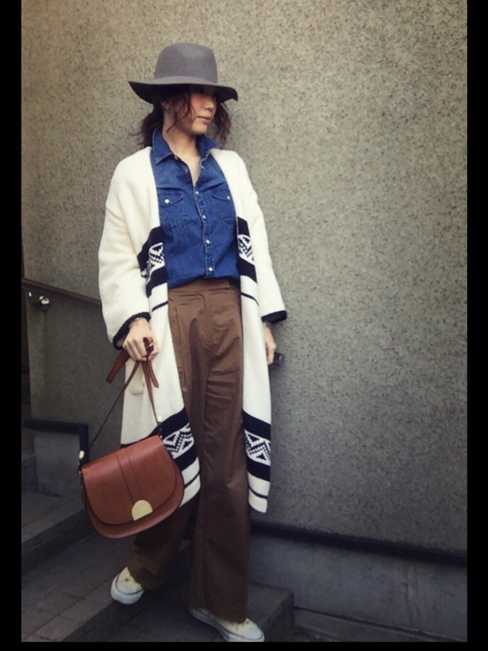 ☆ dungaree × brown ☆ 今日は明るいコーデで☺︎ あまりに暖かかったので、 しまい込もうとしてたニットガウンを 引っぱり出してきた😋