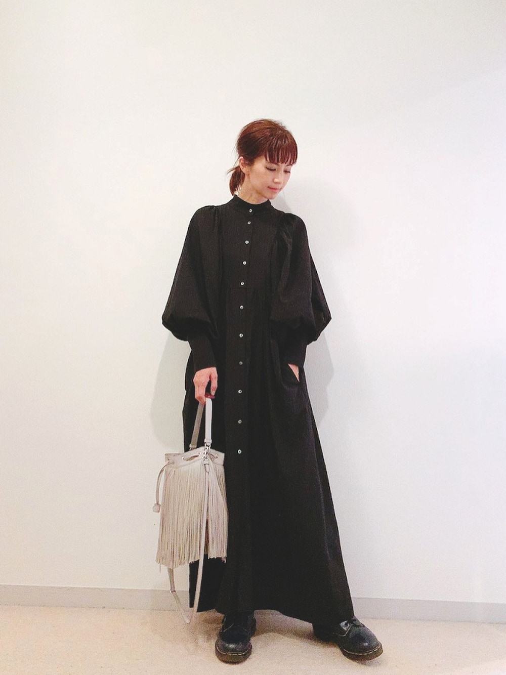 秋のワンピース。袖がパフスリーブでボリュームがある、ちょっと裾がすぼまってるワンピ。 バッグはフリンジが山盛り。