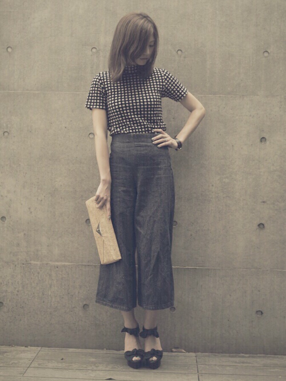 ぴったり、首が詰まり目のギンガムチェックトップスを、ガウチョパンツにイン!
