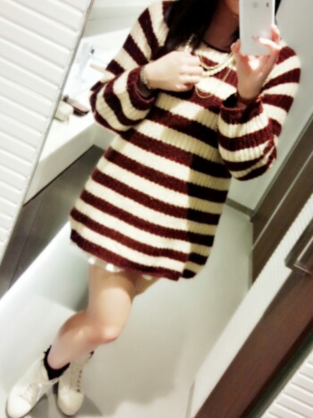私特有の卑猥丈← ニットワンピースをふりふりスカートを入れてフェミニンにしつつ、スニーカーでぬけ感を出したコーデ。 ニットワンピは胸元が寂しいのでネックレスを合わせて。