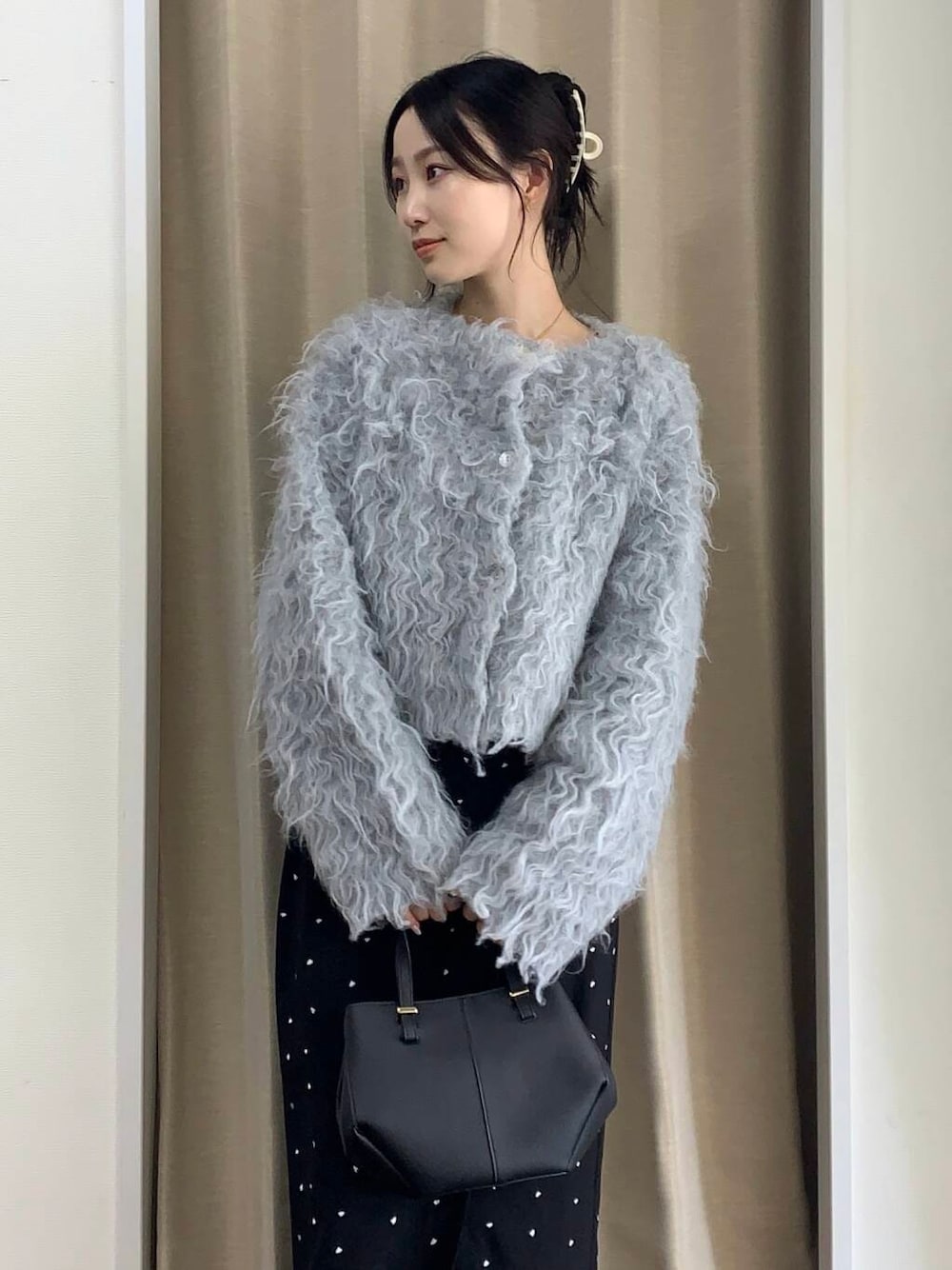 完全にきれいめお姉さまコーデを組みました! オシャレなレストランでのディナーやクリスマスデートそんなシーンをイメージして組みました!! シャギーのアイテムは前後2WAYで着られる優れものです!ボタンが付いており、カーディガンとしても着れるので羽織りにも使えます!!