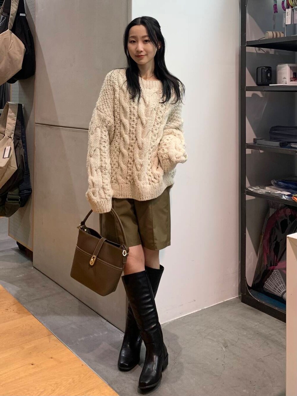 かぐれのニットをちょっぴりフェミニン風でコーディネートしてみました! ザクザク編みのニットがたまらなく可愛いですよね。。。。 この時期のハーフパンツにはやっぱりロングブーツ1択です!ドアーズのロングブーツは少し広めなデザインなのでそれが、脚を細く見せてくれるんです♪