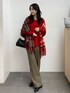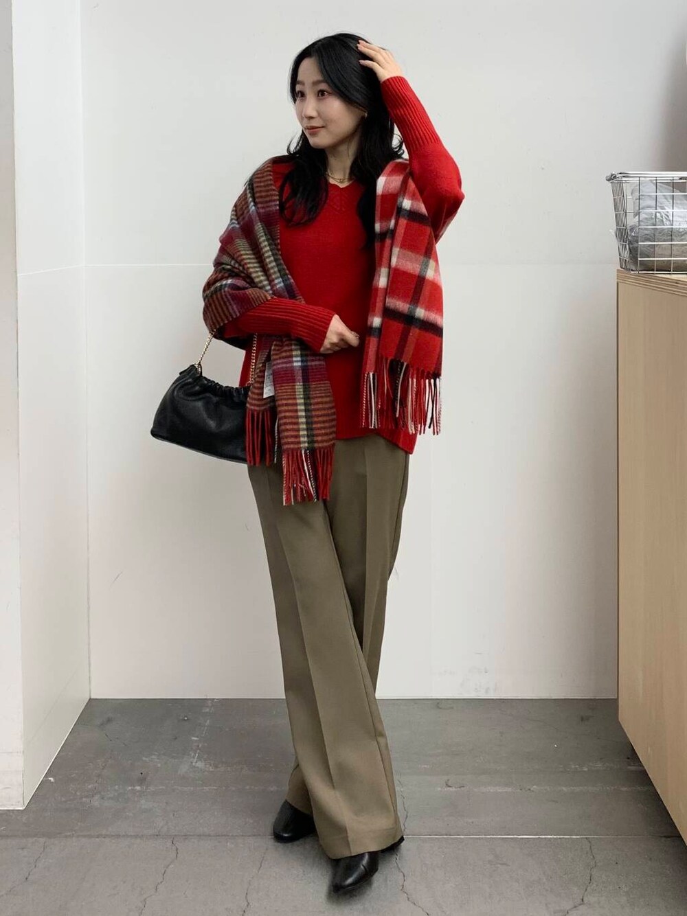 赤でニットとマフラーを合わせました^^ トップスのニットは袖の部分のみが少し細めになっていて、メリハリあるニットです! 下に合わせたパンツは、程よくフレアな形なので、女性らしさがあり、骨格ウェーブの方にはおススメです☆