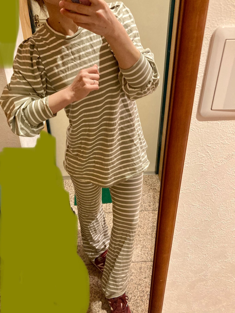 グリーン系のルームウェアを着用したレディースの秋コーディネートの1枚目の写真