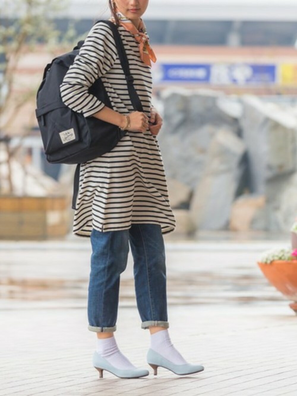 ボーダー✖️デニムの鉄板コーデも 白靴下とパンプスを合わせて ちょっぴり大人っぽくしてみました☺️ ライトブルーの色使いなら 軽やかさが上がります〜✨ やっぱり着慣れたカジュアルアイテムなら 気軽に色に挑戦しやすいです😊