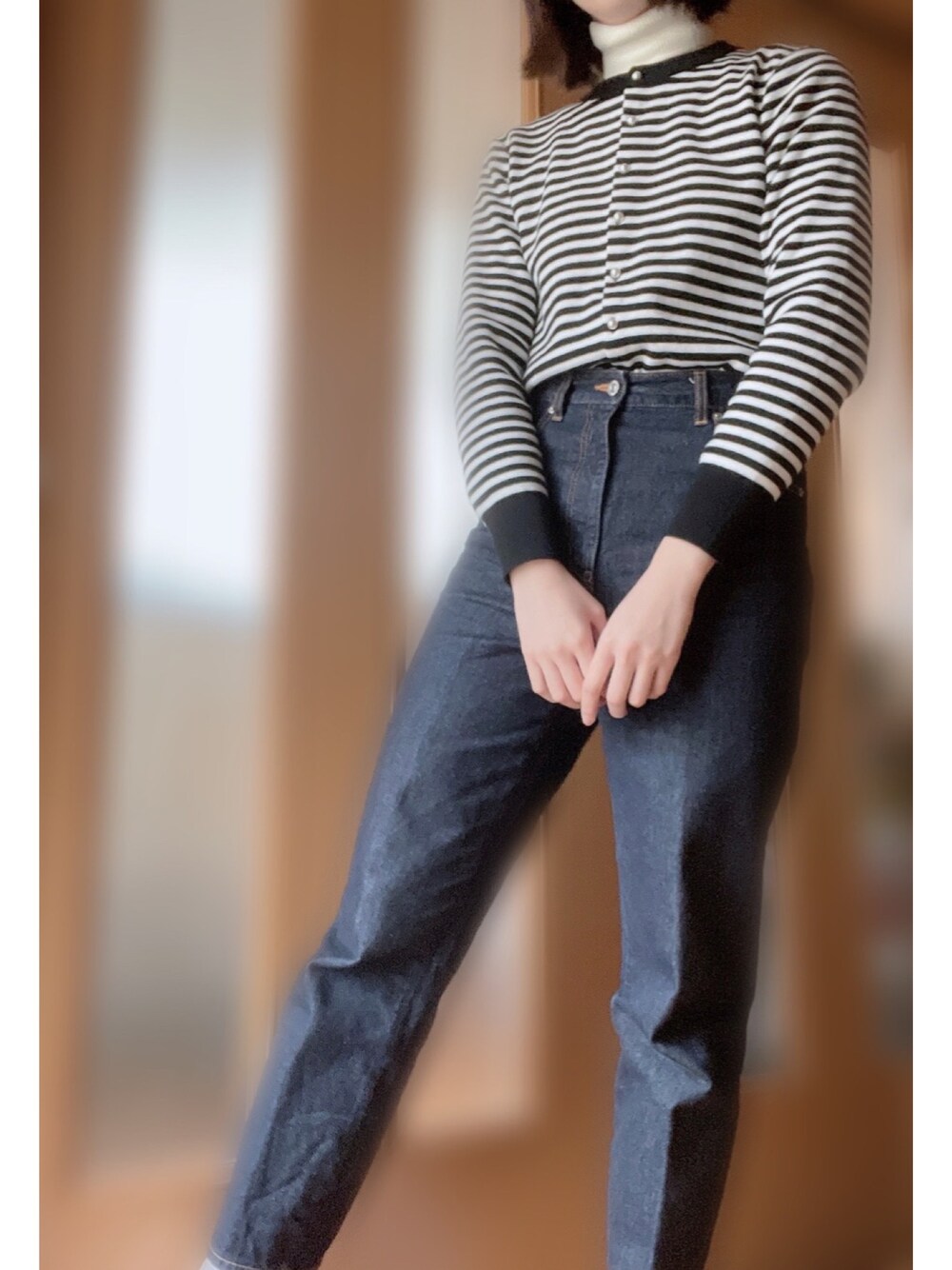シンプルデニムコーデ モノトーンボーダーなカーディガン ボタンがパールになってます˚✧₊⁎