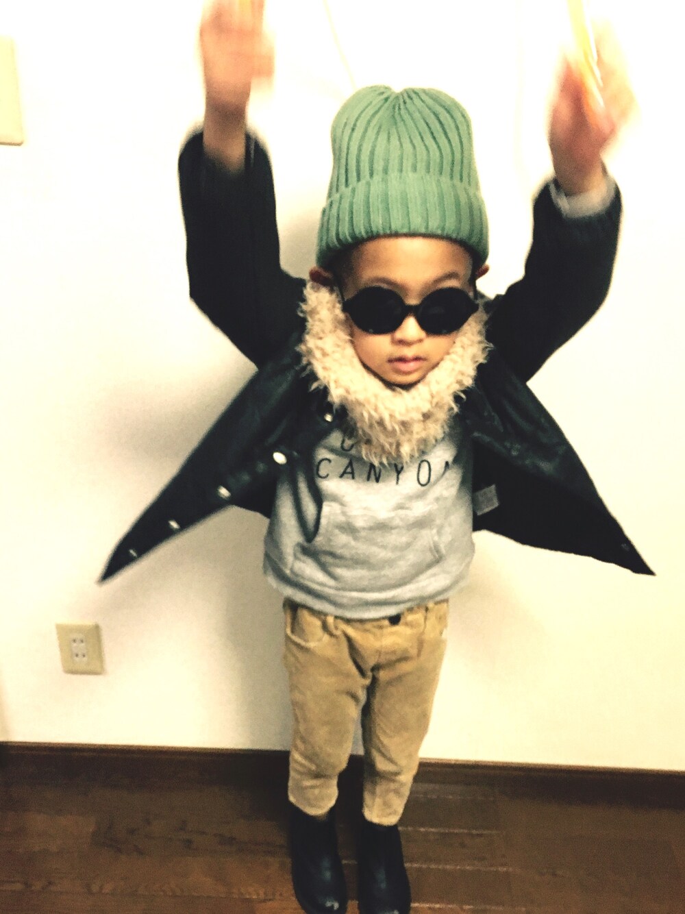 狭い部屋で縄跳びするのはやめて欲しいです。 ファーのマフラーは百均です☺︎