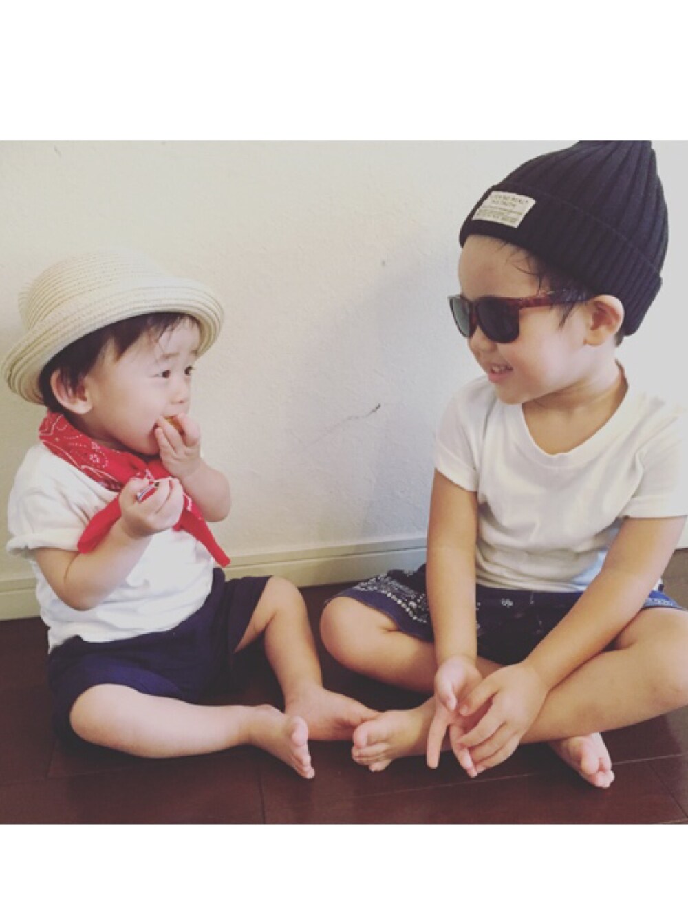 ペイズリー柄の短パンと 首に巻いたバンダナでリンクコーデ❤️