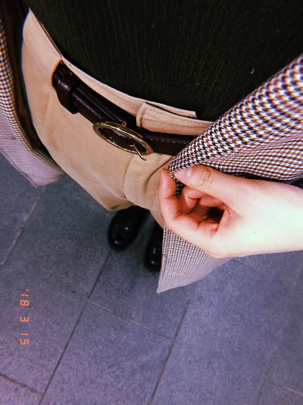 鏡がなかったので、頑張ってもこれ。 ベージュベースにグリーンのニットを着てハンサム女子コーデに仕上げしました。