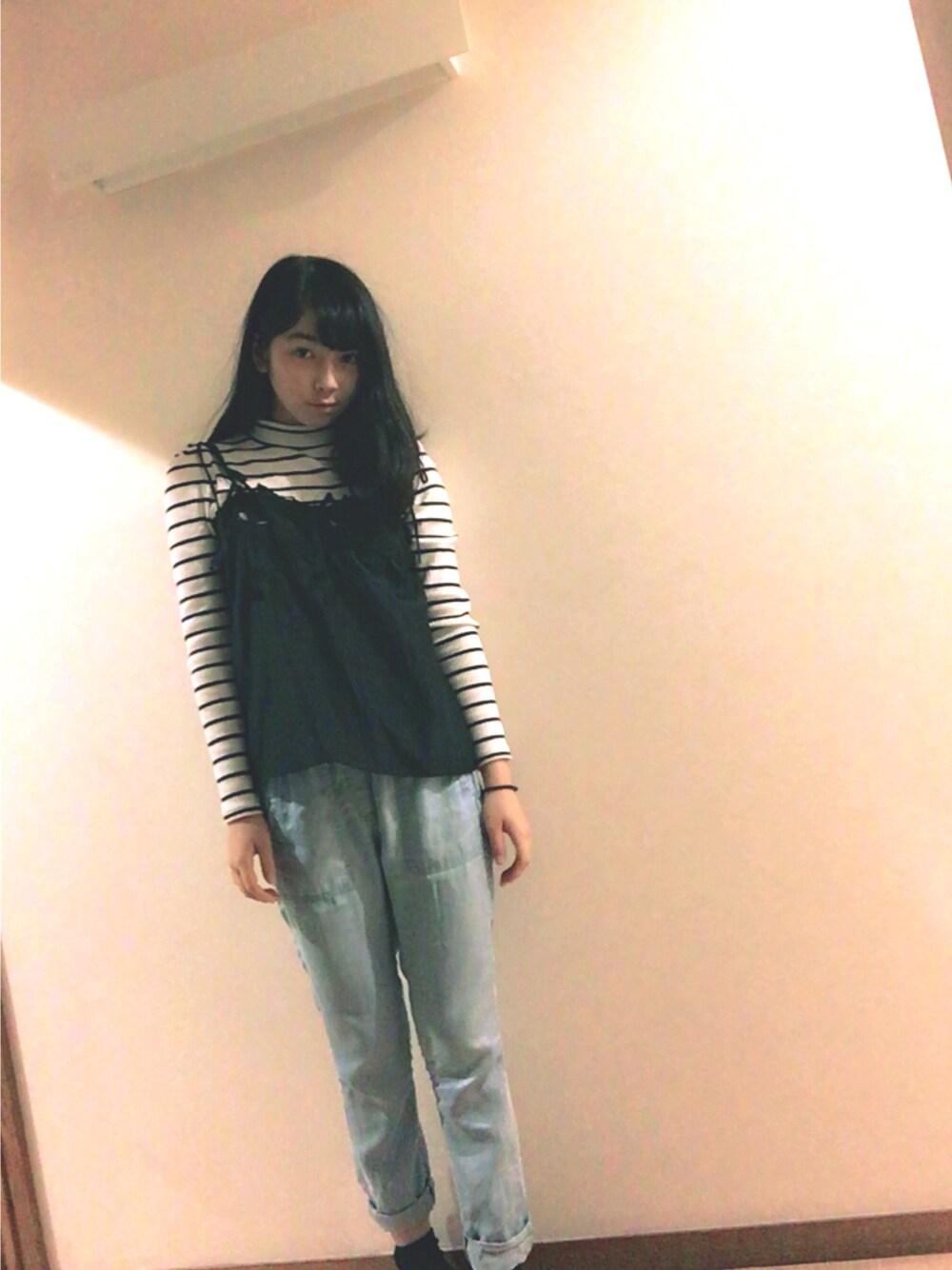 ぴたっとしてるハイネックの 服の上に流行りのキャミソールを 組み合わせました! ぴったりしてると体型が見えやすいため カバーもばっちりです◎ 肩が くしゅっ となってるとこが ガーリーでキャミソールもリボンで 可愛いです🎀
