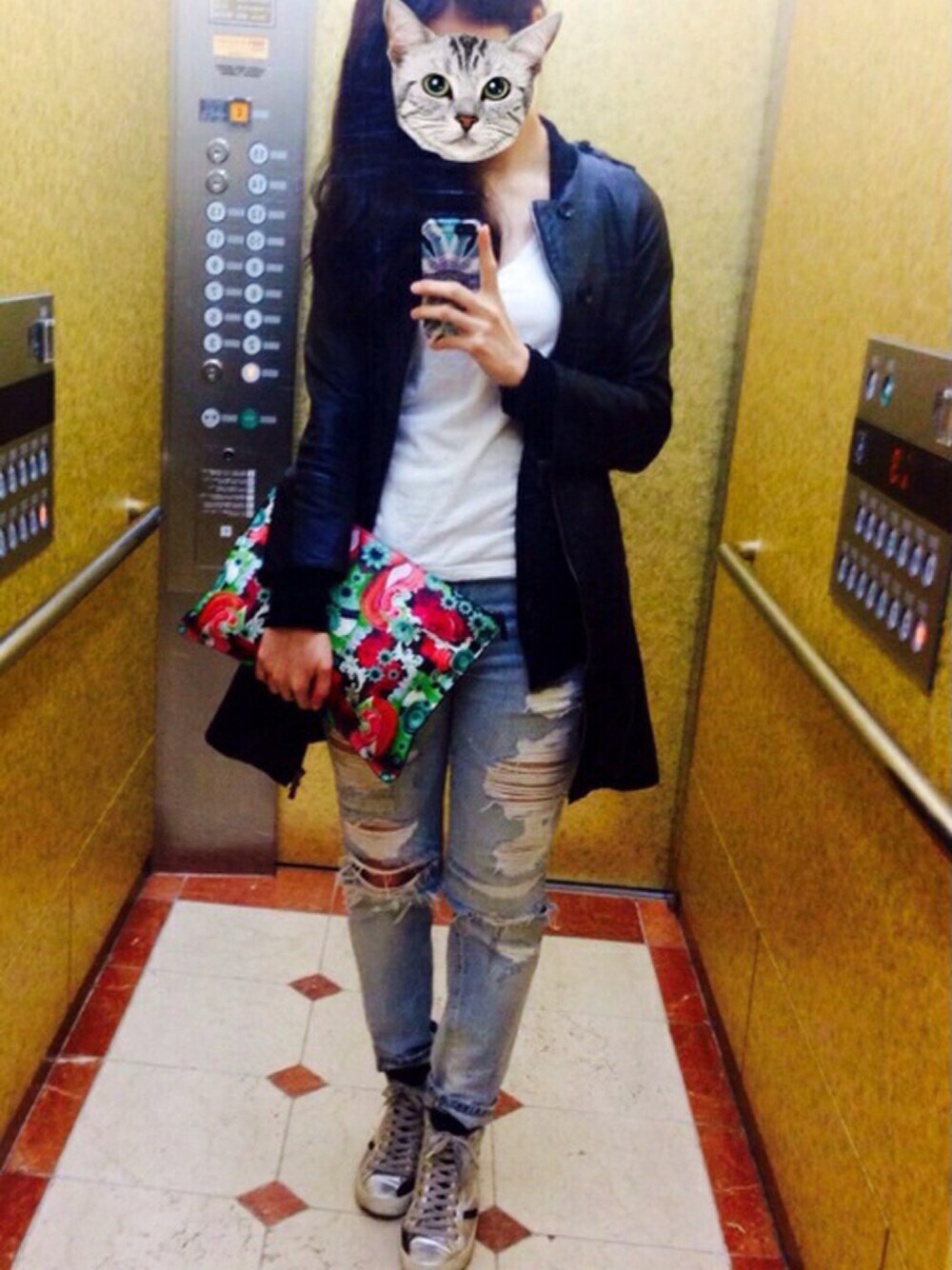 レザーコート、Tシャツ、デニム→stunning lure スニーカー→ATTIMO バッグ→PAPURIKA