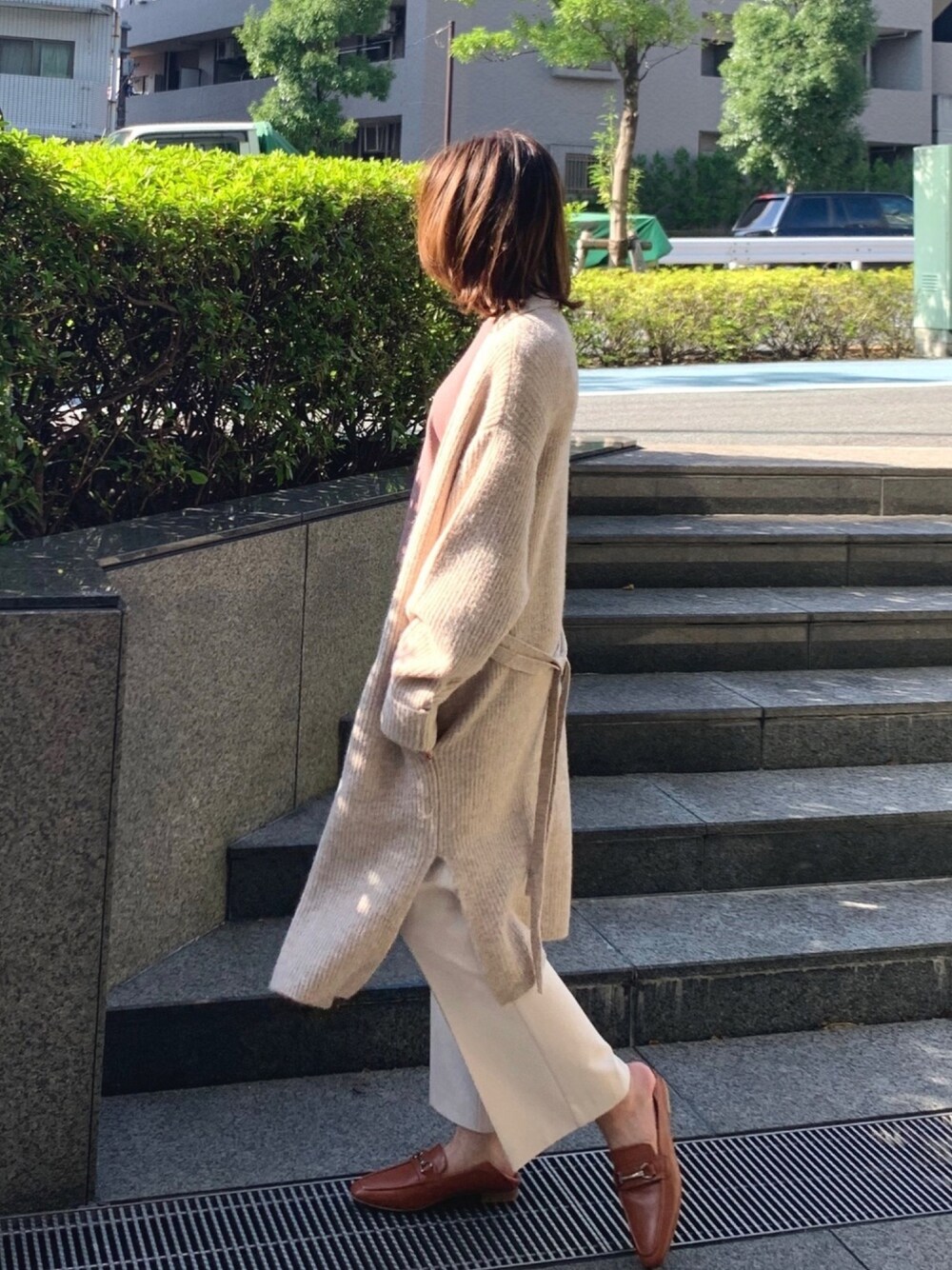ほっこりフワッとしたベージュのカーディガンをさらっと羽織ってみました! 共地ベルトが付いているのでガウン風にも前で結べますが、今回は後ろに結んでラフに♩ 着丈も長めで合わせやすいので、コーディネートに迷わず羽織れてとっても便利です✨ crie conforto