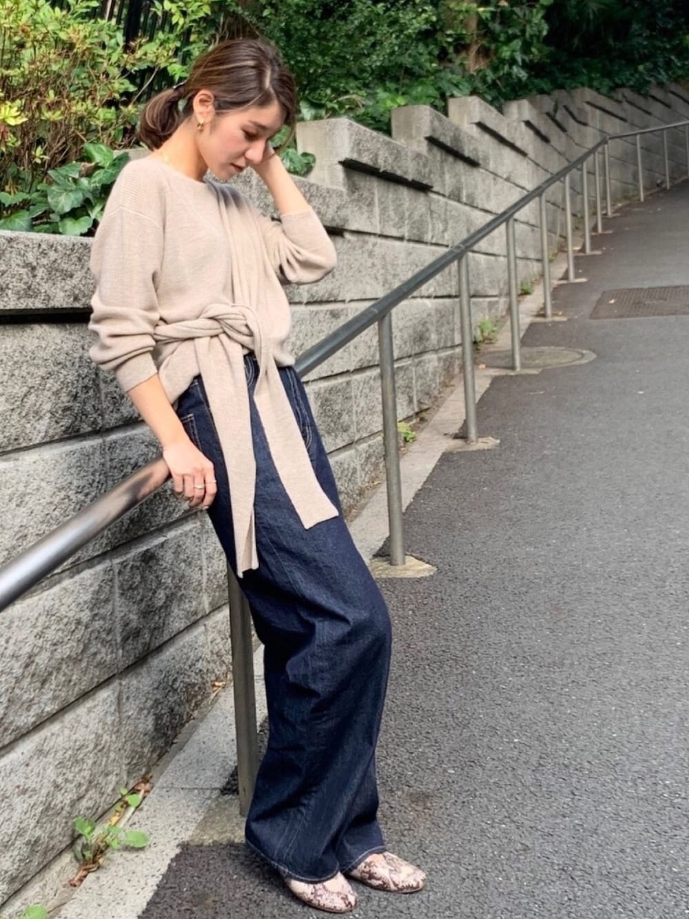 アシメで片側が結べるようになっているデザインのニット💫 やわらかいベージュが今年の気分です♩ 重ね着などしなくても、存在感のある一枚🙆♀️ シンプルにハイウエストのワイドデニムと合わせて、足元はパイソン柄のパンプスをアクセントに🔸 crie conforto